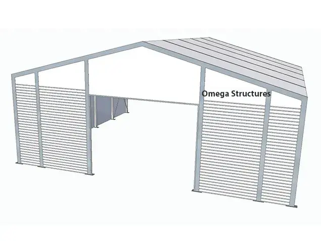 Les portiques sont reliés par des pannes intermédiaires et latérales, renforcées par des diagonales ou croix de Saint-André, assurant rigidité et stabilité à l’ensemble. Les pièces d’assemblage en acier galvanisé, traitées contre la corrosion, garantissent une tenue parfaite dans le temps, même en milieu humide ou salin.