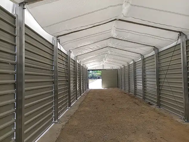 La toiture est conçue en membranes PVC hautement résistantes, capables de protéger efficacement contre la pluie, le vent et la neige. Elles offrent également une luminosité naturelle idéale pour l’intérieur du chapiteau de stockage.